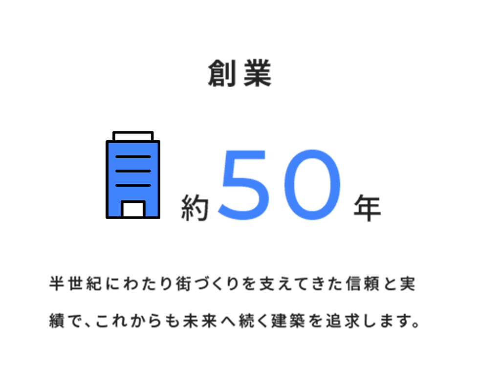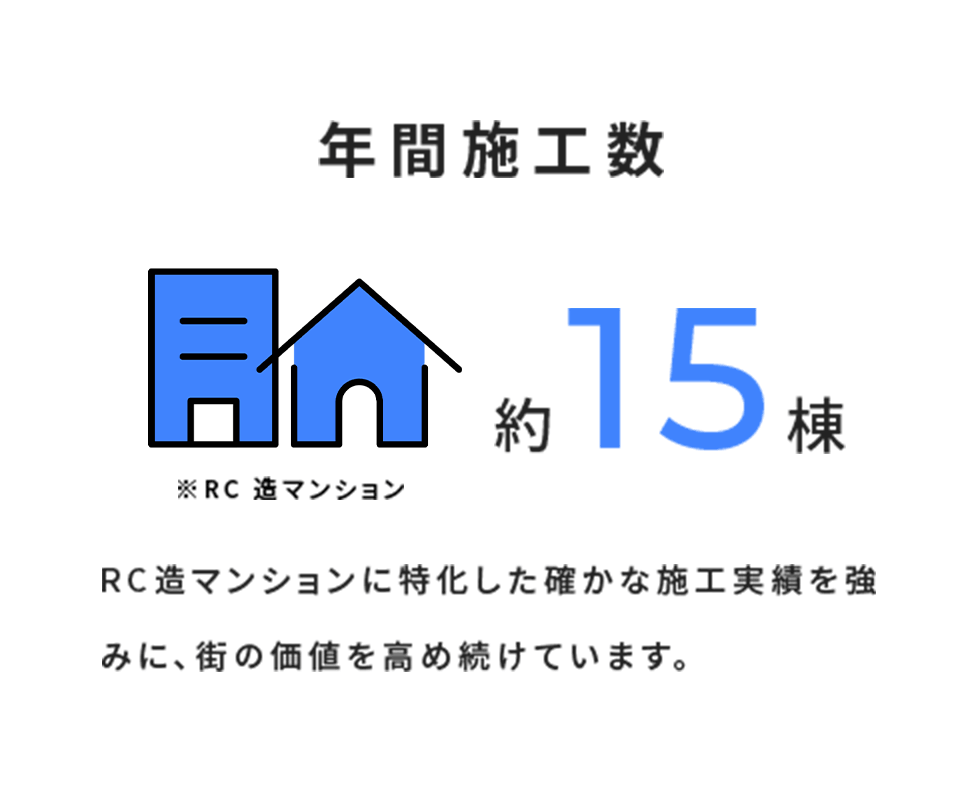 現在はRC造マンションを中心に、企画・設計から施工・管理までを一貫して対応。特許技術を活かした高付加価値な建設を強みに、地域に密着したパートナーとして、豊かな都市環境と住まいづくりに貢献しています。